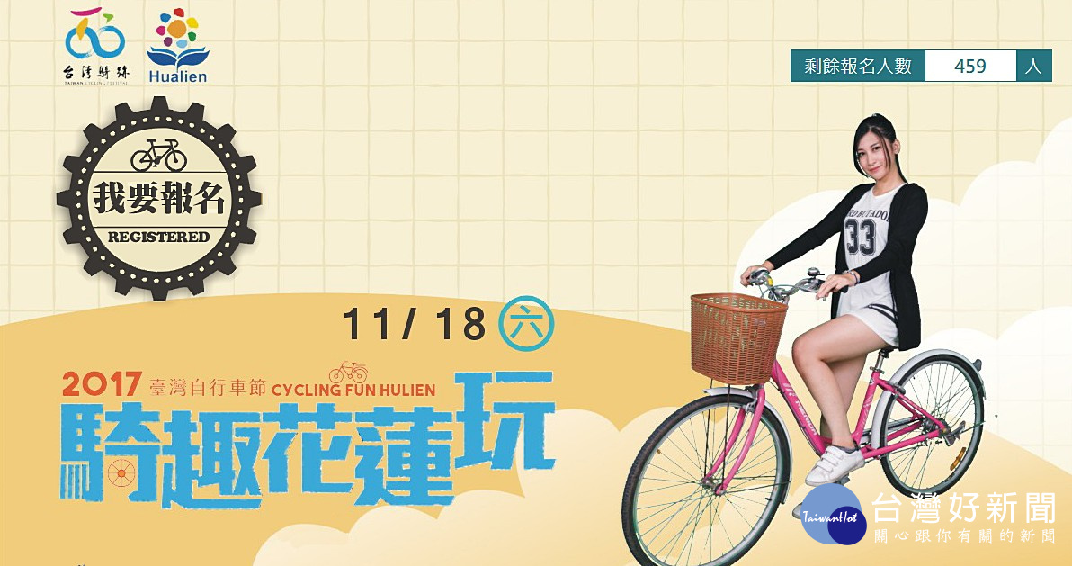 為鼓勵民眾騎自行車體驗花蓮好風景,花蓮縣政府訂11月18日(週六)於太平洋公園(北濱段)舉辦2017臺灣自行車節「騎趣花蓮玩」親子活動,於10月23日凌晨起開放網路報名,因民眾熱情參與,1,500名額全數額滿,主辦單位追加400個名額,邀請更多民眾一起健康運動拿好禮。
