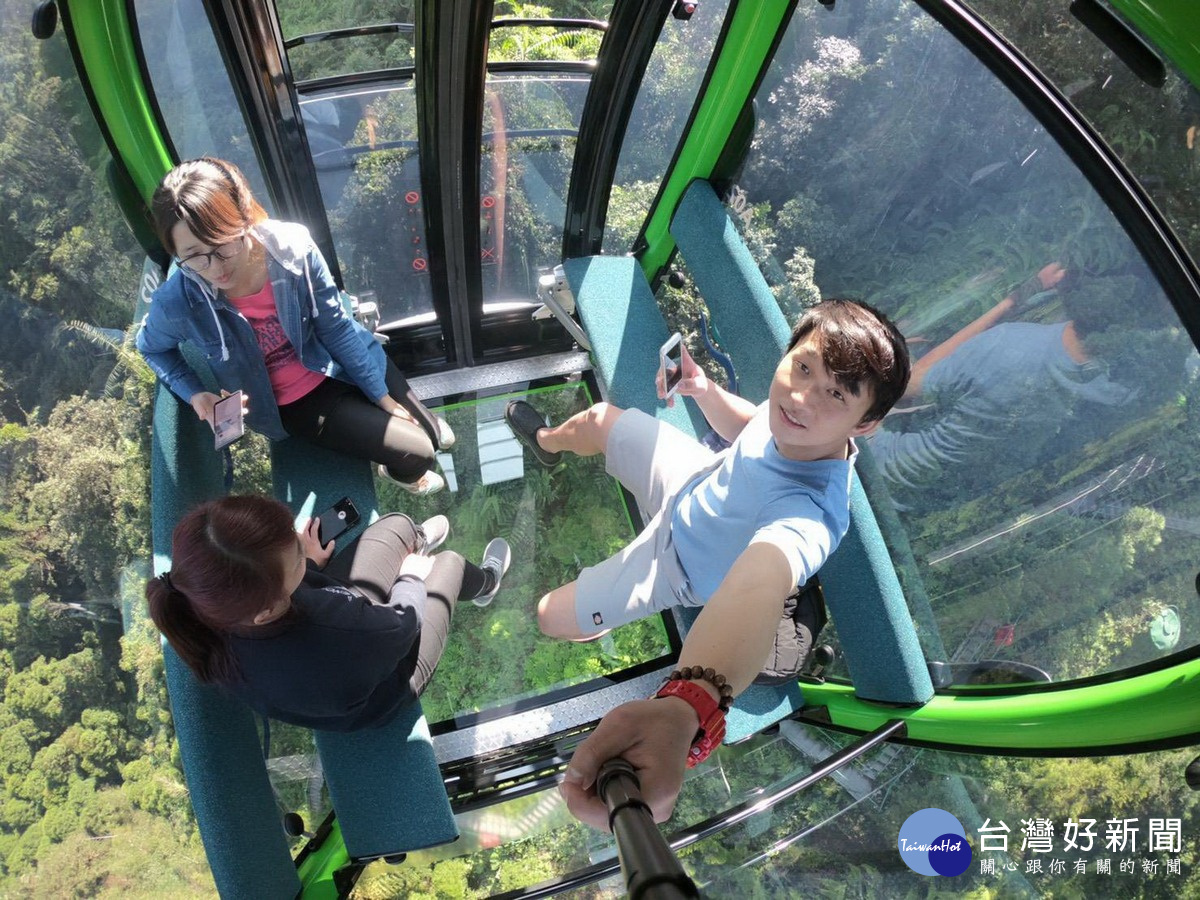 遊客搭日月潭透明水晶纜車玩自拍。
