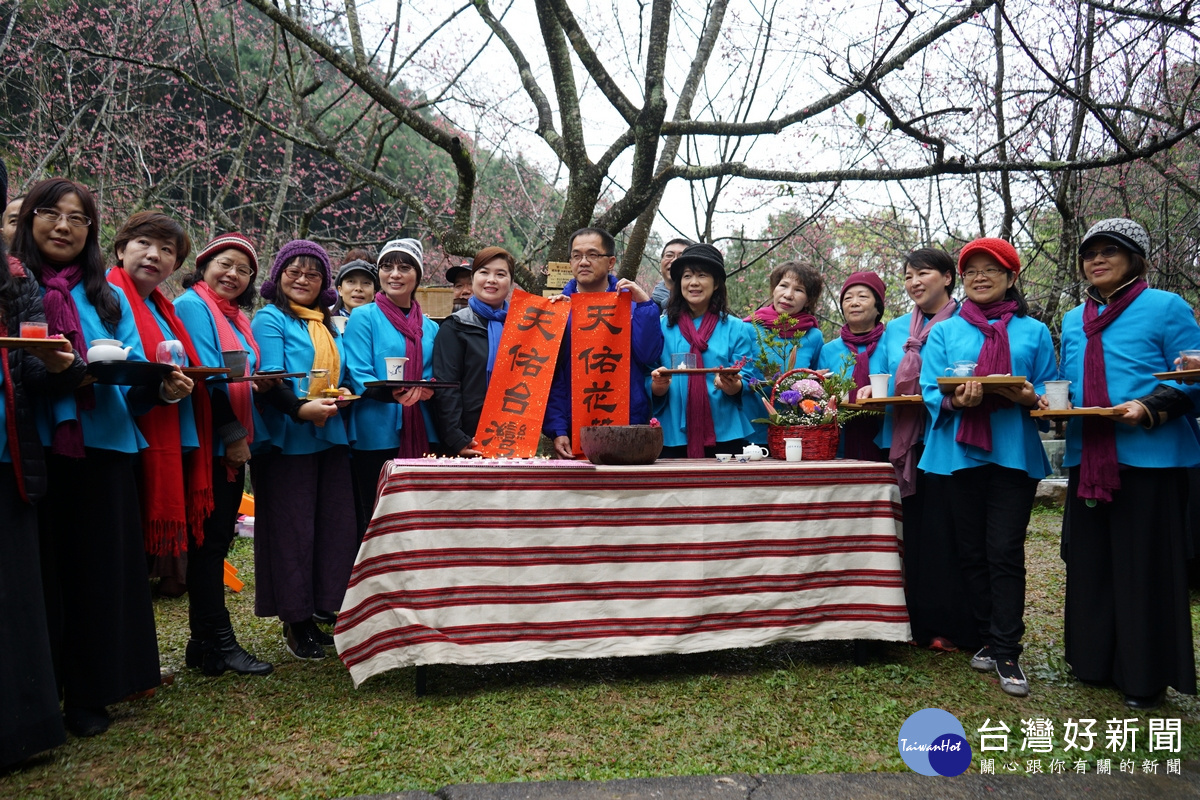 茶師們齊聚九族櫻花湖畔櫻花樹下,並由魚池鄉公所鄉長夫人王秋淑,代表陳錦倫鄉長致詞發表櫻為愛、我們一起為台灣、為花蓮祈福。