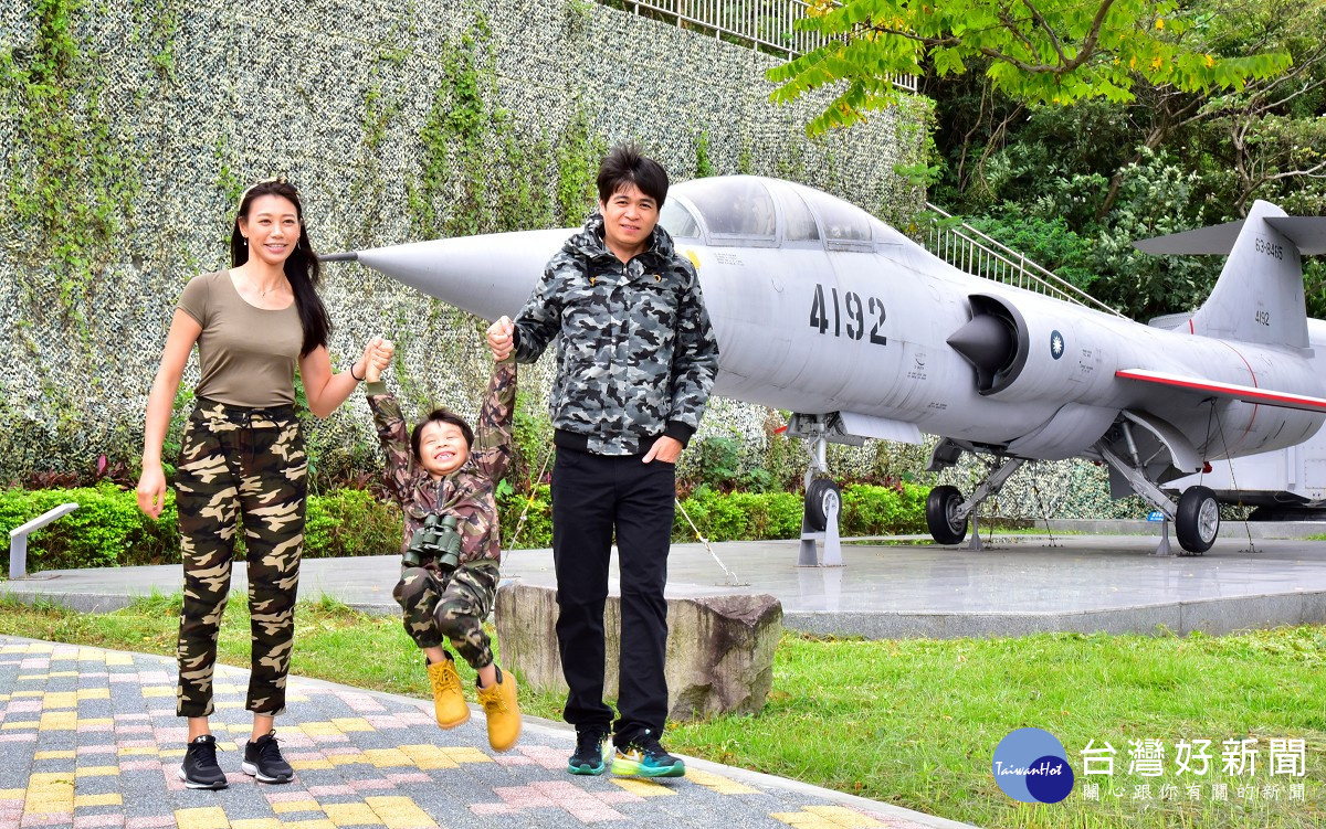 另住在泰山區的江姓父母帶著孩子穿上迷彩親子裝來到武器公園,近距離觀賞F5-E老虎二式戰鬥機,江太太利用QRCODE智慧掃描讓孩子專注聆聽經典老戰機的過往輝煌,小男孩身上帶著望遠鏡、呼叫機等軍用道具,興奮得蹦蹦跳跳好不快樂。