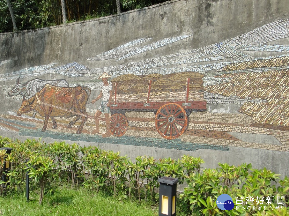 公園坡崁水泥壁上一幅精細的馬賽克壁畫,為台南知名藝術家顏水龍先生的作品,以「稻浪」、「泥巴」、「貝殼」和「螢火蟲」紀錄台北盆地的變遷,「從農業社會到工業社會」描繪早年台灣傳統農業恬靜勤耕的景象,構圖溫馨且具現代感,全長100公尺、高4公尺,俗稱水牛圖。