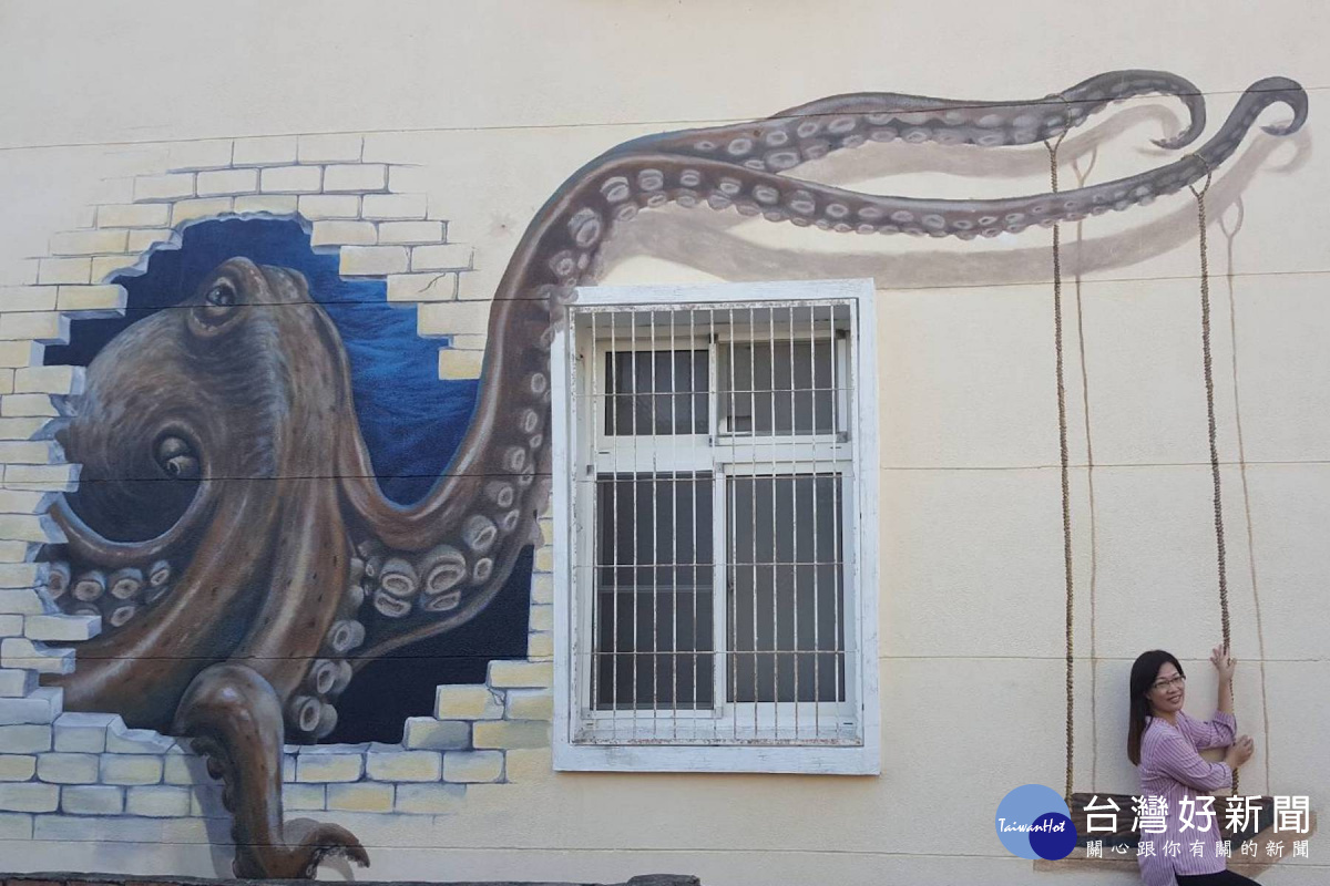結合將軍漁港意向,增添漁村風貌,大章魚趴在牆上,章魚腳成了大人大孩玩鞦韆,相當很有趣,前往拍照的遊客稱讚很有漁村風景,紛說創意無限,會介紹朋友們前往旅遊拍照。