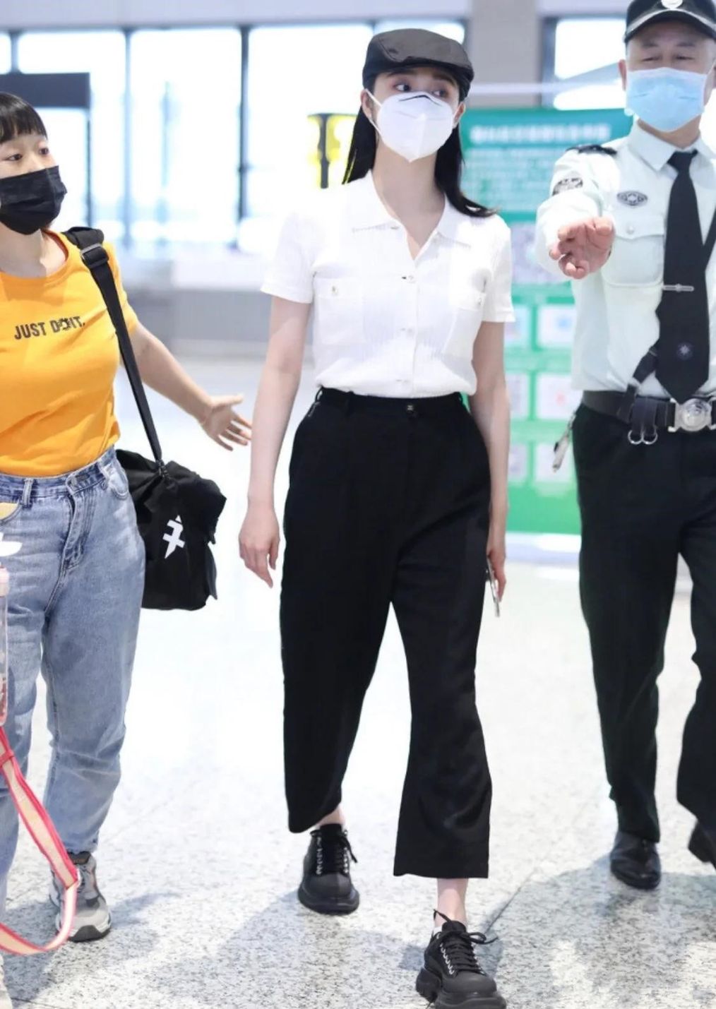 周潔瓊穿白襯衣黑褲搭鴨舌帽