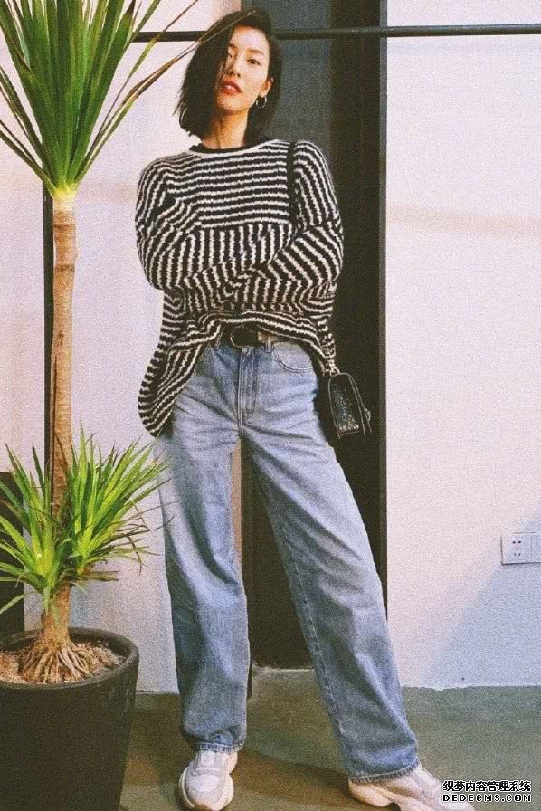 先來看看她平時生活中的穿搭風格,她身穿一件黑白條紋的毛衣,衣服很寬鬆,盡顯休閑范。她在下面搭配了一條淺色的牛仔闊腿褲,更顯輕鬆風格。劉雯將毛衣的一小部分扎進了下面的褲子中,顯得很隨意。她踩着白色的椰子鞋,透出青春活力感!